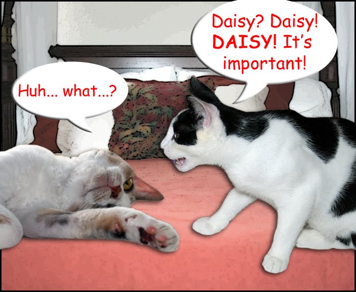 A HA HA HA...Daisy we think a whap is in order! Mom doesn't agree as we believe she has a slight bought of ADD herself! She'll be in the middle of a sentence then go, "Ooo look, a kitty". MOL!!!